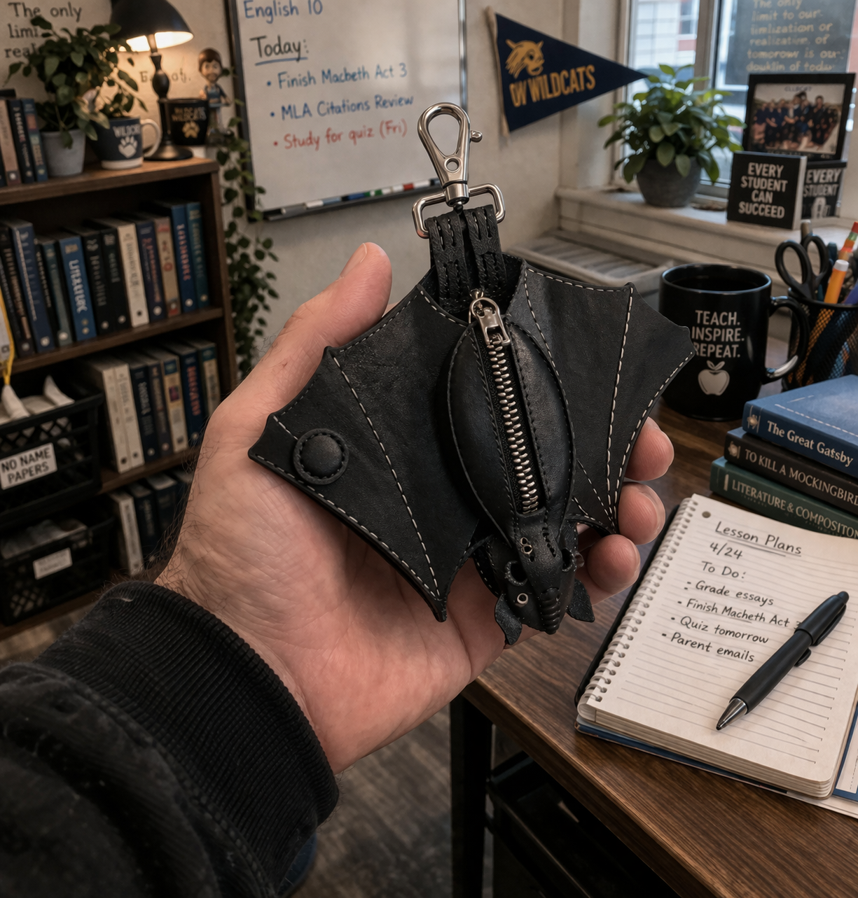 As a high school teacher, I appreciate well-made, unique items that show personality without sacrificing practicality. The quality of this wallet is fantastic—the leather feels sturdy, the stitching is clean, and the zipper works smoothly. It’s small enough to carry around easily but still holds my keys and a few essentials. I’ve even had a few students ask where I got it because the bat design is so cool. Definitely a fun and well-crafted accessory.